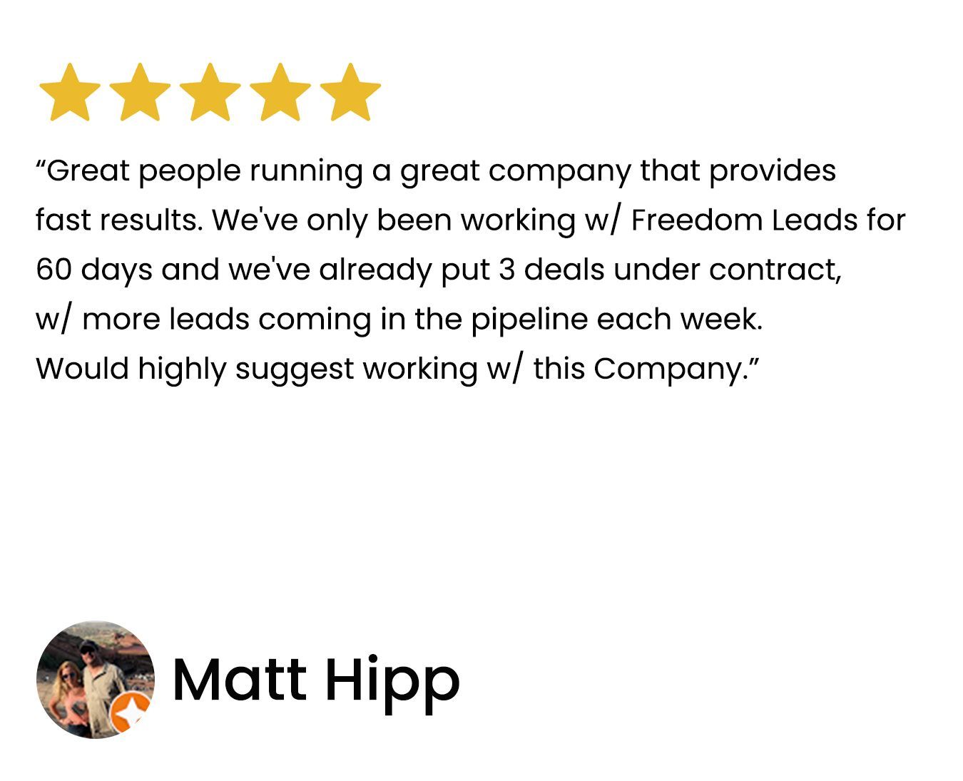 "Great people running a great company that provides fast results. We've only been working w/ Freedom Leads for 60 days and we've already put 3 deals under contract, w/ more leads coming in the pipeline each week. Would highly suggest working w/ this Company."